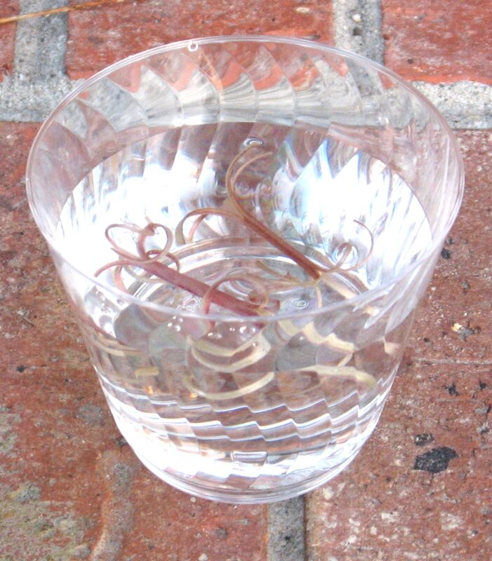 Don’t get in too big a hurry to mow off those dandelions. They are a great source of entertainment for children as well as food for a variety of pollinators and birds. The stems of dandelions have a little known trick of their own. All you need is the stems and a container of water to make dandelion curlicues. These pictures show the simple steps: