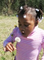 Kyra knew another trick that we have probably all tried at one time or another. Who hasn’t blown on a ball of dandelion seeds and watched them scatter? Did you make a wish before you blew on it?